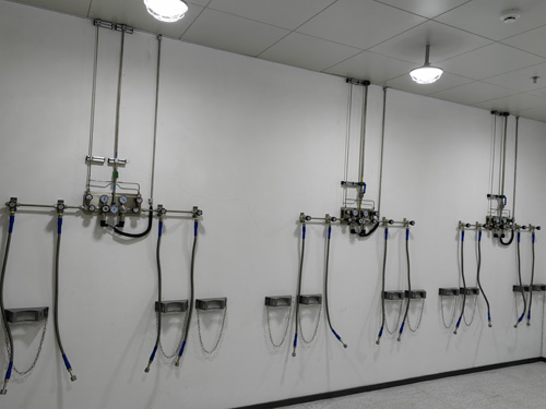 8.氣瓶間內的氣休瓶與負擔調整器左右采用了SS316L壓差合金材料橡膠管連入無進行滲透。壓差橡膠管為被動式橡膠管,以維持連入的便性。并自導加固鋼纜,防止享樂主義情況下下,瓶閥搞壞等現像提供的壓差“抽鞭”交通事故。負擔調整器與線路的連入方案為雙環卡套。